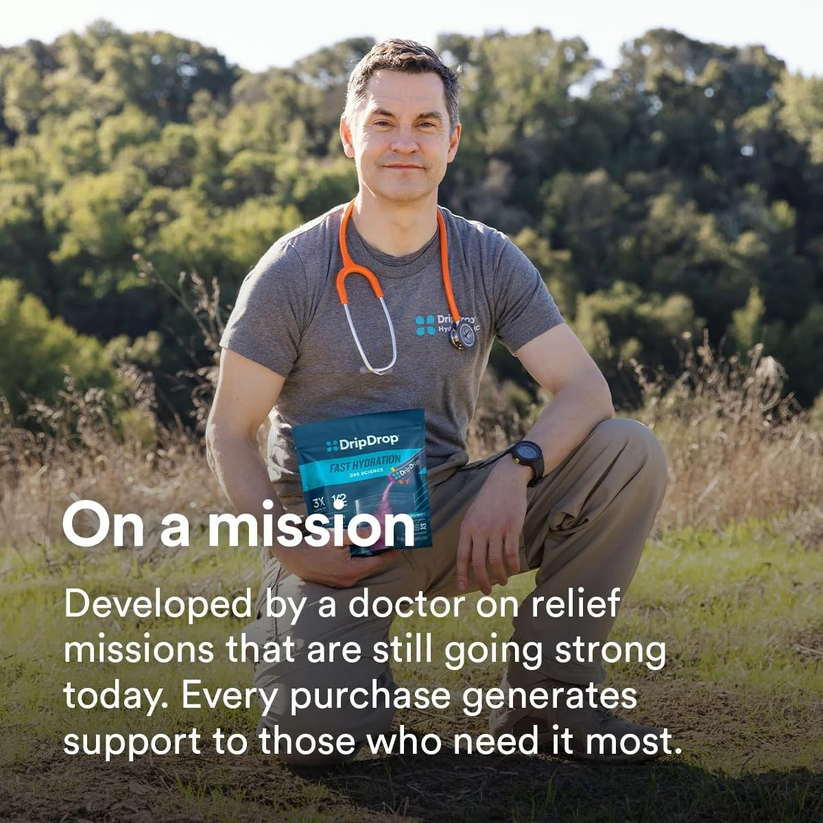 DripDrop was developed by Dr. Eduardo Dolhun, a physician and humanitarian who saw the urgent need for effective hydration when IV therapy wasn’t available during disaster relief missions. His science-based electrolyte formula was designed to rapidly replenish essential fluids and nutrients, helping people recover from dehydration faster than water alone. Today, that same doctor-developed formula powers every stick of DripDrop, providing hydration you can trust for daily wellness, travel, exercise, and recovery.